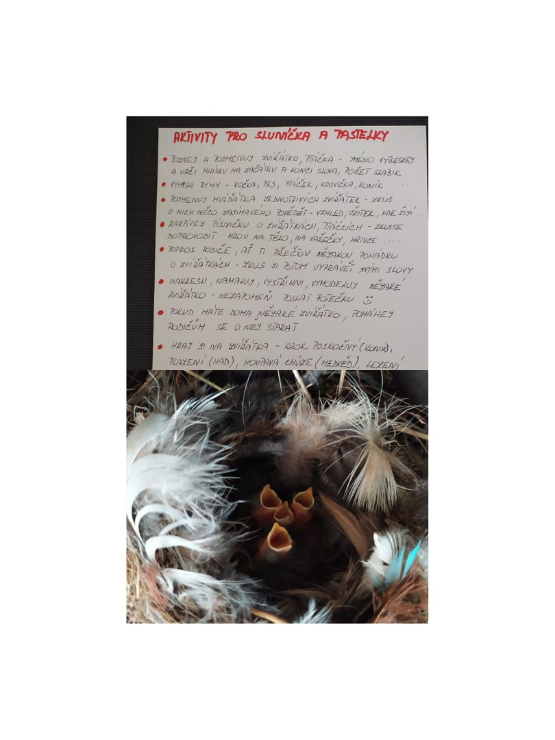 Milé děti, milí rodiče ….zase je za námi další týden, kdy spolu komunikujeme na dálku. Připravili jsme pro vás aktivity na tento týden. Inspiraci jsem čerpala u nás doma v altánku. Usadili se u nás čermáčkové a jak vidíte, čtyři mláďátka už otevírají zobáčky. A téma jako stvořené pro jarní měsíce – Zvířátka a jejich mláďátka, je na světě. Děkujeme za vaše příspěvky od dětí. Moc si toho vážíme.