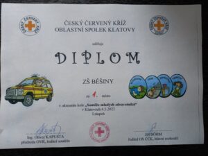 Soutěže se zúčastnilo celkem 12 hlídek, 6 hlídek v I. kategorii. V několika disciplínách museli zvládnout základy první pomoci. Naši žáci si vedli na výbornou, vybojovali zlatou příčku. Přivezli pohár, diplom, medaile, a dárkové tašky. Tímto výsledkem se nominovali do krajského kola, které se uskuteční 28. 5. 2022 ve Vejprnicích. Poděkování patří nejen žákům, ale i paní Mgr. Veronice Matějkové, která se vzorně postarala o jejich přípravu.