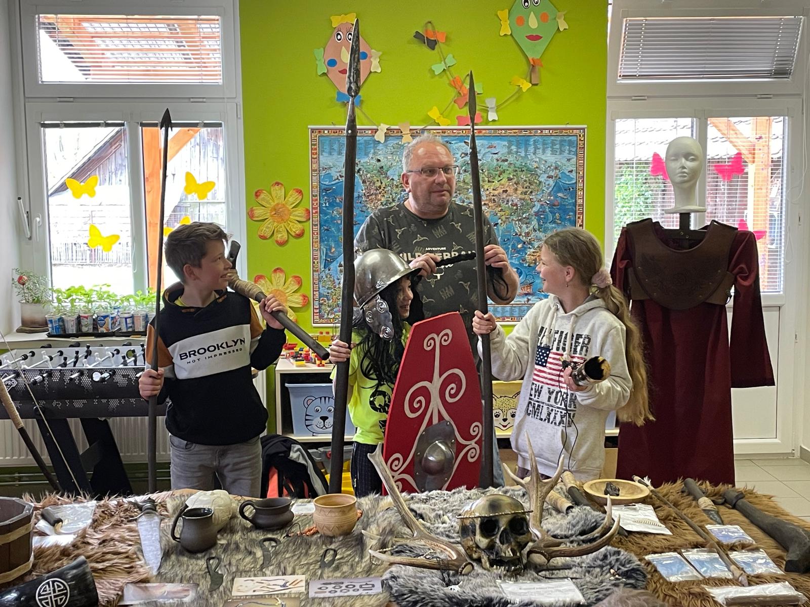 24. dubna 2024 zažili žáci úžasné dopoledne se známým historikem Liborem Markem. Připravil projektový den nazvaný PRAVĚK. V první části zhlédli prezentaci s výkladem života lidí v jednotlivých etapách pravěku. Ve druhé části si prohlédli repliky známých archeologických nálezů, účastnili se módní přehlídky pravěkých dámských šperků, prohlédli si též zbraně a pracovní nástroje. V závěrečné části se soutěžilo ve výtvarné disciplíně. Nejlepší kreslíři získali vzácné mince – duhovky.