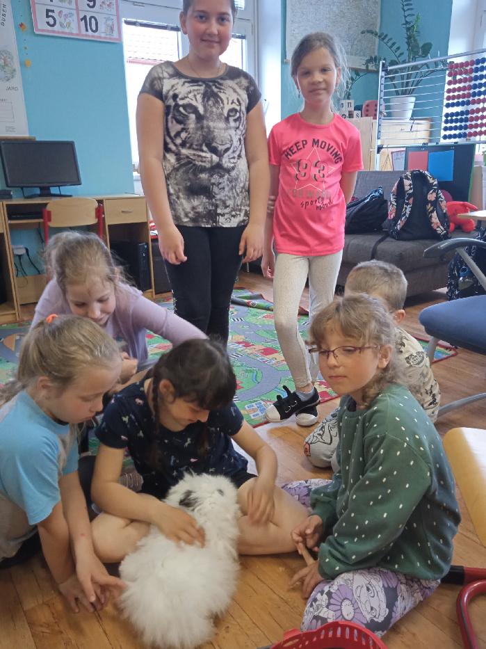 Téma domácích mazlíčků jsme si společné s žáky 1. a 2. ročníku zpestřili názornou ukázkou. Do školy dnes Ondru Maláta doprovodilo jeho morče a navštívil nás i králíček paní učitelky Matějkové.